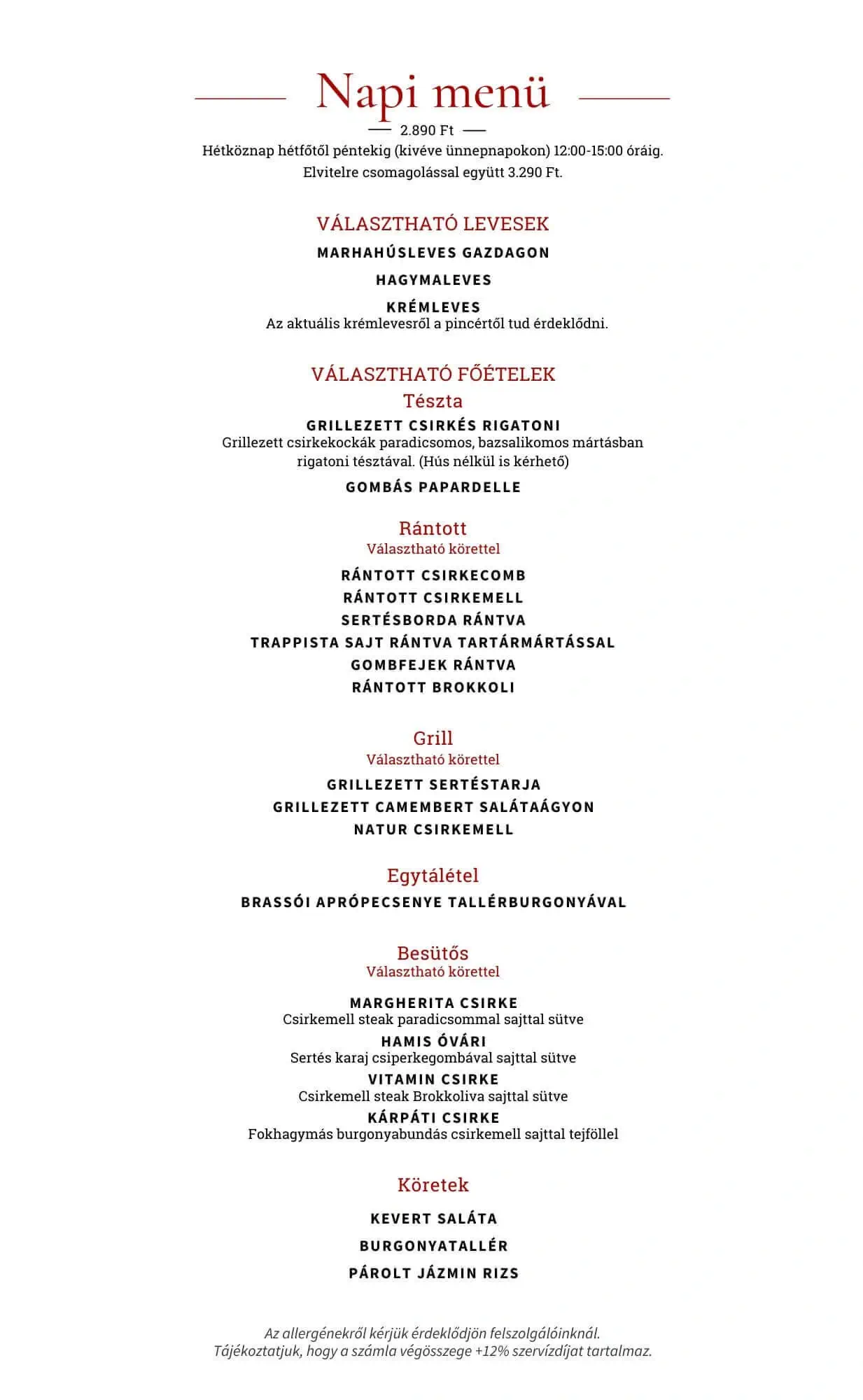 Rántott csirkemell, kárpáti borzaska, rántott sajt, cigánypecsenye, csirkemell steak, tallérburgonya, tartármártás.